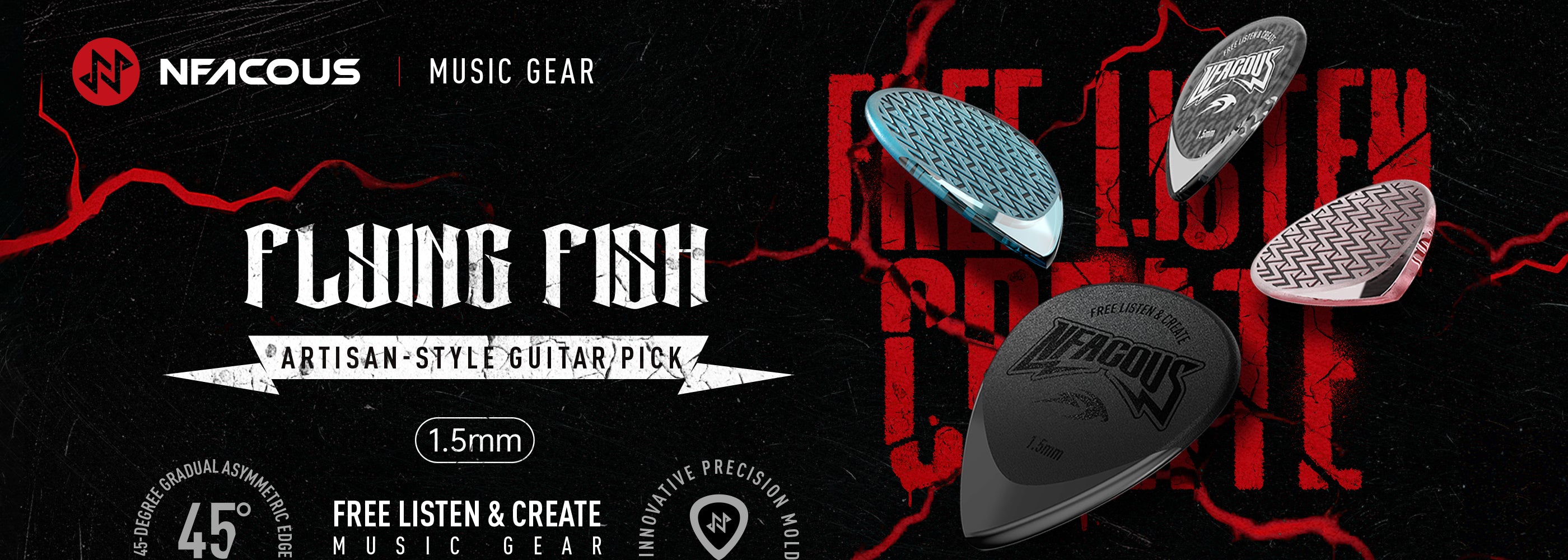 A pick's strumming and grip require different surface textures-smoothfor contact and rough for grip. The Flying Fish features an electrochemicalmirror polish for quicker transitions. Inspired by NF ACOUS' new logo,the anti-slip design combines two laser-etched textures,VDl 18 and VDl 33, for a comfortable feel and perfect balance.