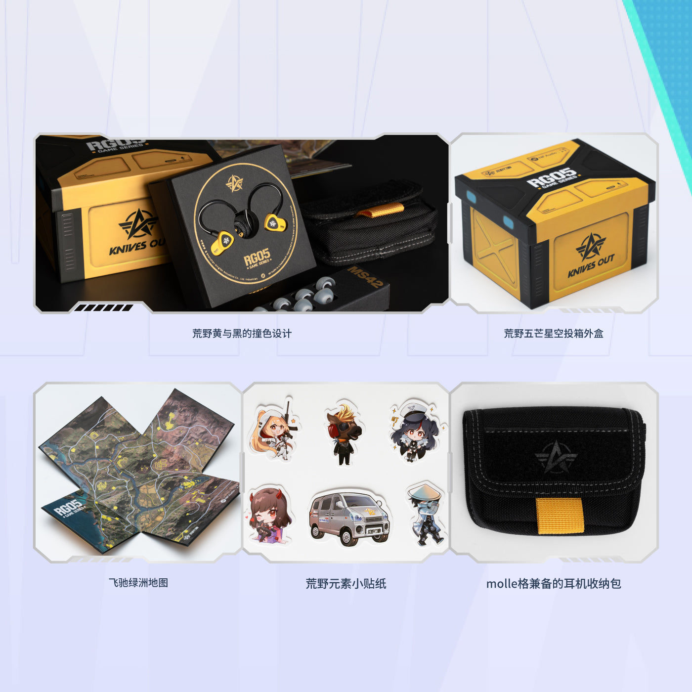 RG05《荒野行动》特别联动款,耳机本体采用经典品牌色荒野黄与黑色的撞色设计,激光镭雕的五芒星代表着一场又一场的胜利。包装采用经典空投箱外盒搭配飞驰绿洲地图的内置设计,可抽拉弹夹式硅胶套盒,打造沉浸式产品体验。更有弹道尼龙和molle格兼备的耳机收纳包,荒野元素小贴纸,细节拉满,更帅,就是更强。