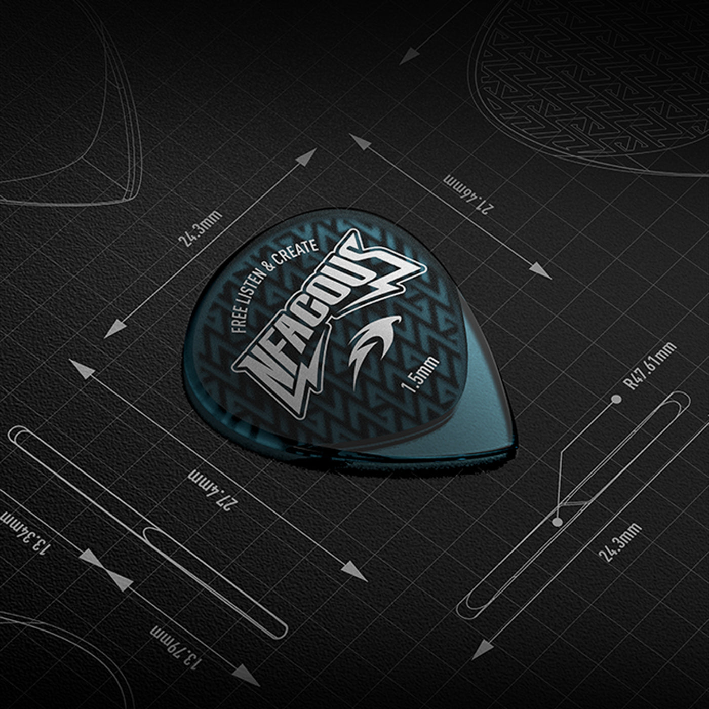拨片造型对手感和拨弦特性影响很大。参考市面上众多经典拨片,结合人体工程学,飞鱼的造型拥有超强的风格适应性。1.5mm黄金厚度,恰到好处的尖角,圆润舒适的握持部分,无论电吉他的节奏,还是速弹,甚至是贝斯,都可以很好的驾驭。