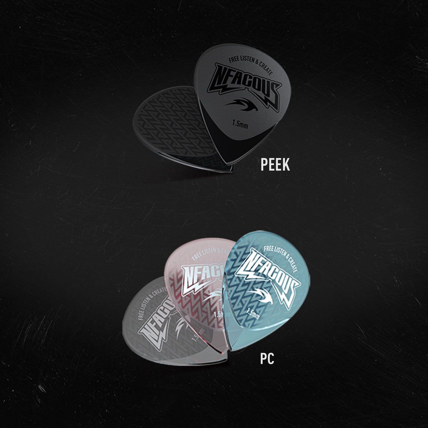 材料是拨片的重中之重,音色,握持感,弹性,耐用性,都与材料性能息息相关。飞鱼系列拨片拥有两款性能不同的材料,更好满足您的音色和使用需求。PEEK复合材料-自润滑·音色更温暖。PC高强度聚碳酸酯-透明坚固·音色更明亮。